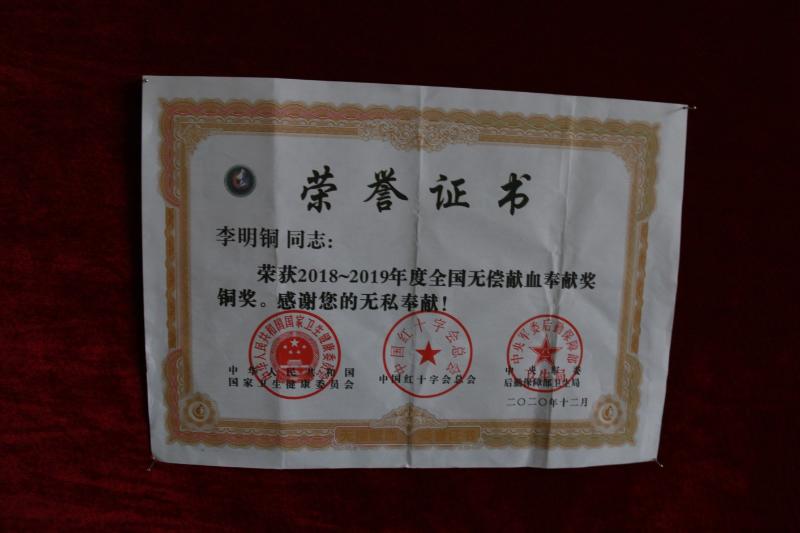 近日,淮北公路部门宋疃道班职工李明铜欣喜的领取了一张荣誉证书,“2018—2019”年度全国无偿献血奉献铜奖。这个奖状是由中华人民共和国、中国红十字会总会及中央军委后勤保障部卫生局联合颁发的。