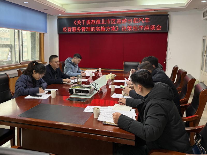 为持续推进出租汽车行业改革,规范巡游出租汽车经营服务管理,1月14日上午,市交通运输局党组成员、副局长黄徽主持召开《关于规范淮北市巡游出租汽车经营服务管理的实施方案》决策程序座谈会。市运管中心、市执法支队、局运输科、法规科相关负责同志参加会议。