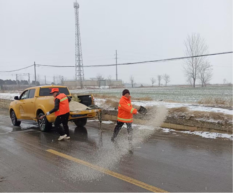 面铺开。按照“人机协同、全域覆盖”的作业原则,一场与风雪赛跑的保通战役在乡村路网打响。在县道、乡道等主干线路段,养护工人高效清除路面积雪,打通交通大动脉;针对背街小巷、田间支路、急弯陡坡等机械作业盲区,发动党员干部、路管员、志愿者开展拉网式精细化清理,确保“不漏一段、不留一角”。为破解背阴路段结冰难题,工作人员科学撒布融雪剂,通过“机械清扫+人工补位+融雪防冻”的立体化作业模式,深夜风雪最烈之时,养护人员仍坚守岗位,用坚守驱散严寒,有效提升道路通行安全系数。
