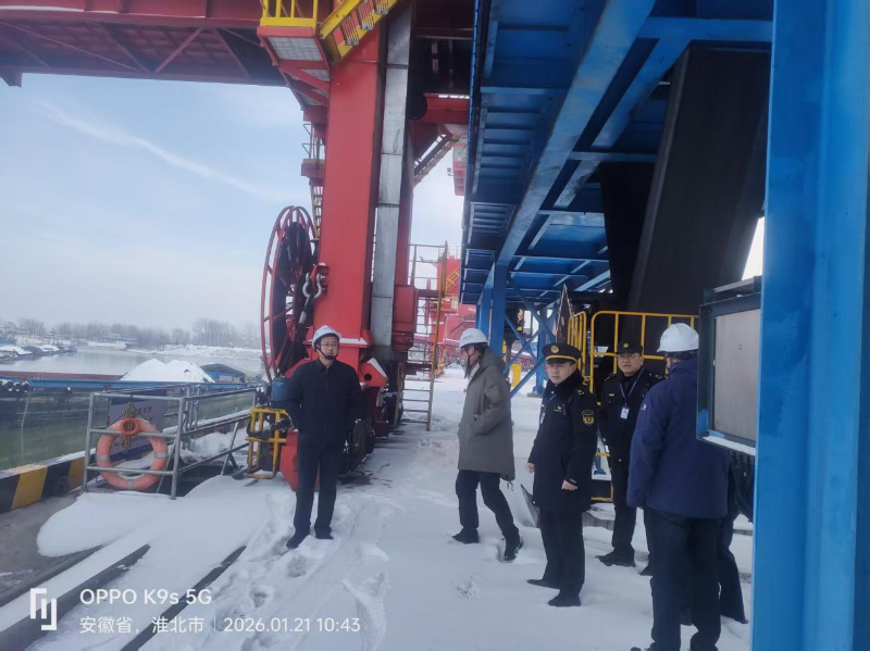 1月21日,孙东主任带领相关工作人员再赴一线,对接孙疃港运营企业,动态掌握煤炭、粮食等重点物资运输计划,指导港口统筹堆场堆存结构,合理调配人力机械,优化装卸作业流程,实现货物“即到即转”,避免因积雪导致船舶滞港,保障港口安全生产。