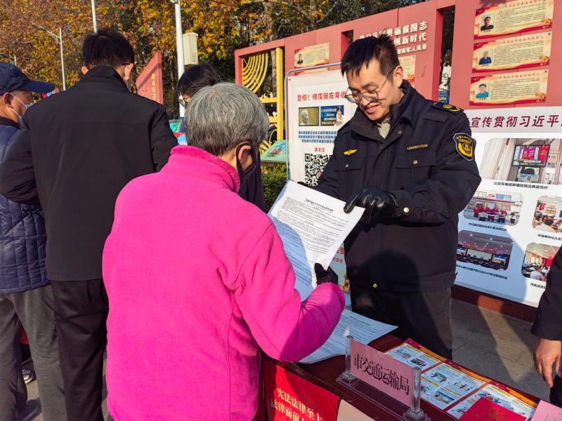 “学习宣传贯彻习近平法治思想,推动宪法深入人心。”12月4日是第十二个国家宪法日。为加强宪法宣传教育,市交通运输局上午在两宫广场开展国家宪法日普法宣传活动。