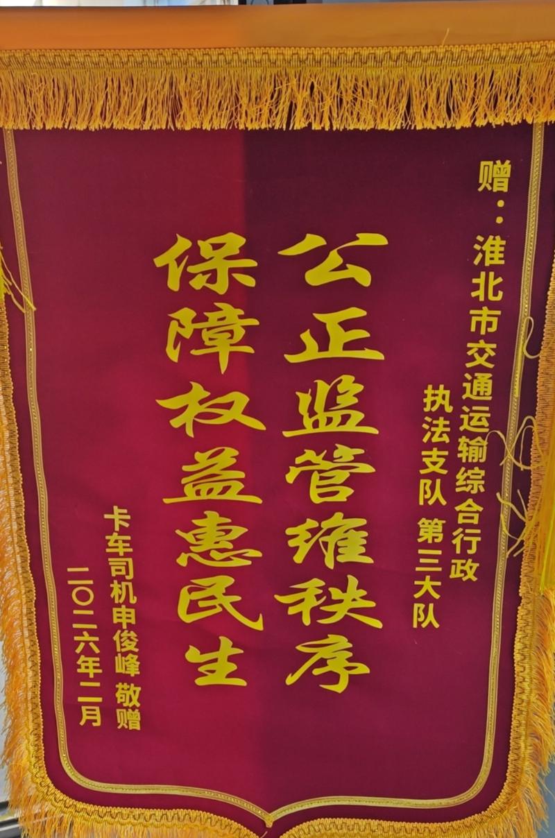 春节假期期间,淮北市交通运输综合行政执法支队收到一份特殊的快递。执法人员拆开包裹,一面绣着金色大字的锦旗映入眼帘,这份满载感激的新春礼物,由一位远在外地的当事人寄出,跨越数百公里,“飞”到了执法人员手中。
