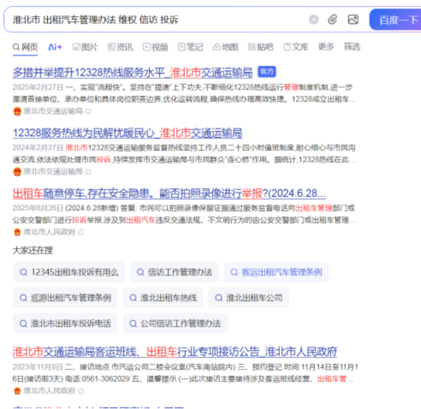 网络媒体在公众意见表达过程中发挥着重要的作用。评估小组通过百度平台搜索关键词组合:{淮北市}+{出租汽车管理办法}+{维权 信访 投诉}等,目前网络未出现淮北市出租汽车工作相关负面舆论信息。