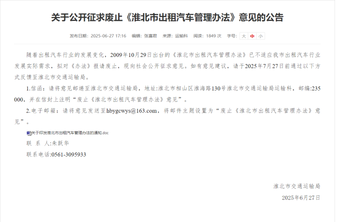 公众意见表达在《办法》实施和废止过程中发挥着重要的作用,通过公开征求意见的方式收集意见建议,2025年6月27日在淮北市交通运输局官网公开征求废止《淮北市出租汽车管理办法》,截止2025年7月27日,未收到关于废止《办法》的相关意见建议。