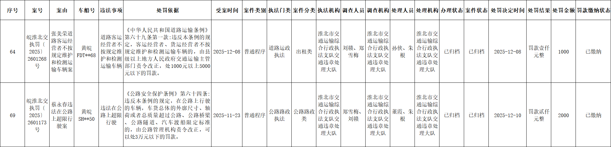 淮北市交通运输局行政处罚公示(2025.12.8-2025.12.14)