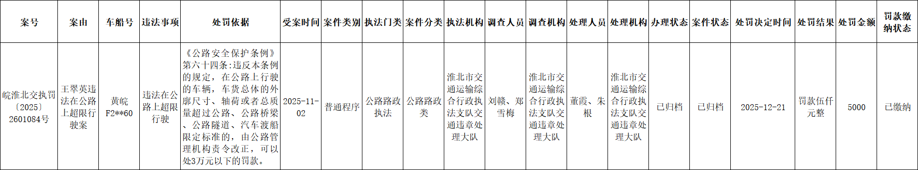 淮北市交通运输局行政处罚公示(2025.12.15-2025.12.21)