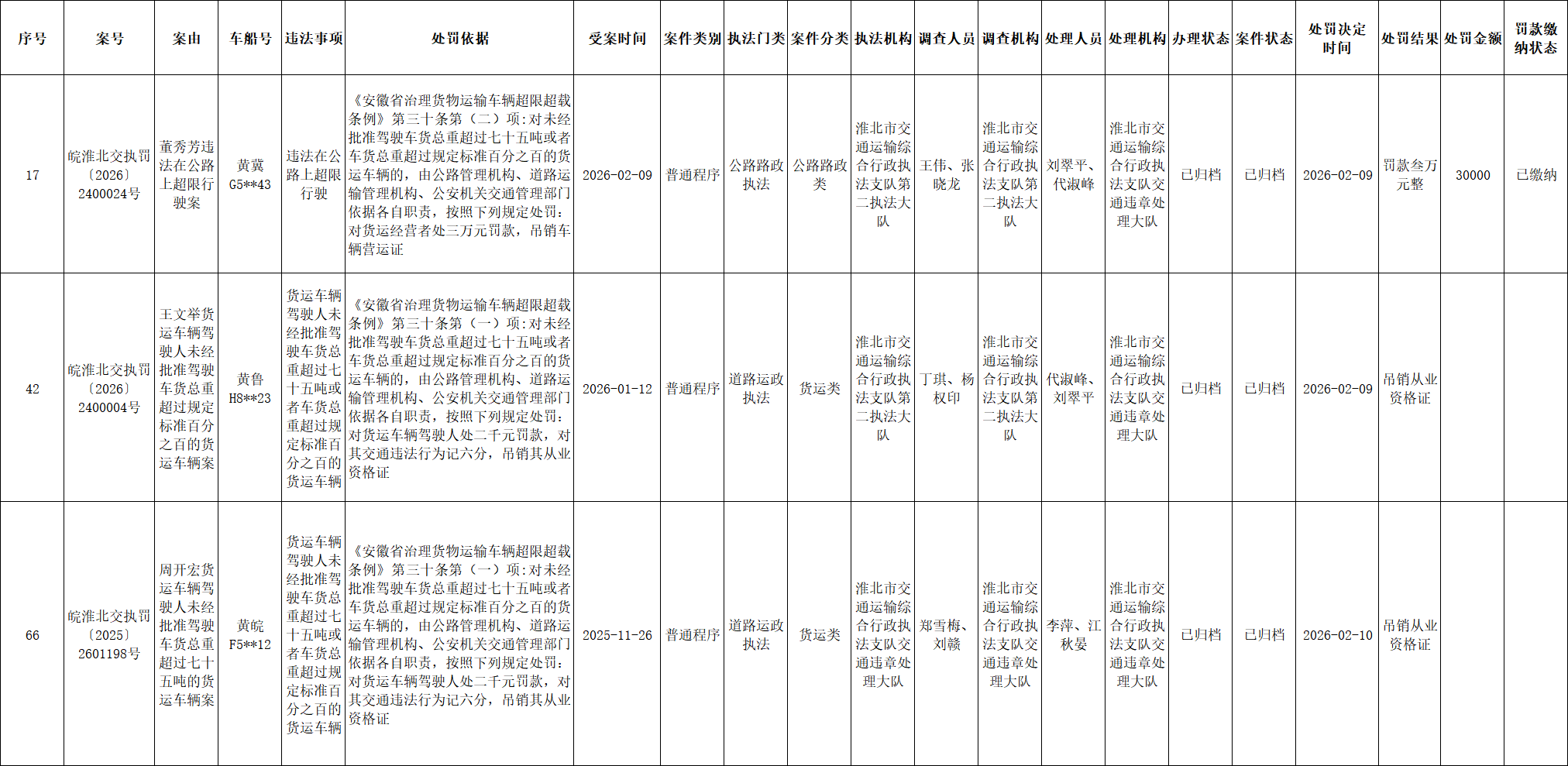 淮北市交通运输局行政处罚公示(2026.2.9-2026.2.15)